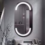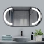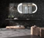 Oglindă cu iluminare LED CAPSULA 04. Forma elegantă a oglinzii se combină bine cu zonele de lumină din partea de sus și de jos a produsului.