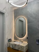 Oglindă CAPSULA 01 Black într-un cadru de aluminiu negru sau auriu cu iluminare ambientală din spatele oglinzii. Suprafața mată a cadrului este o combinație de frumusețe și durabilitate.