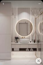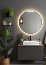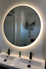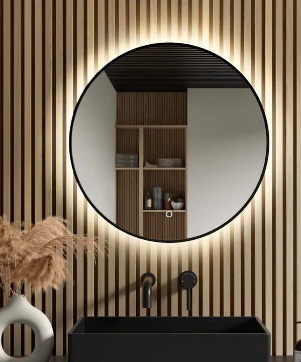 Oglindă RUNDA S Alum într-un cadru de aluminiu negru sau auriu cu iluminare ambientală din spatele oglinzii. Suprafața mată a cadrului este o combinație de frumusețe și durabilitate.